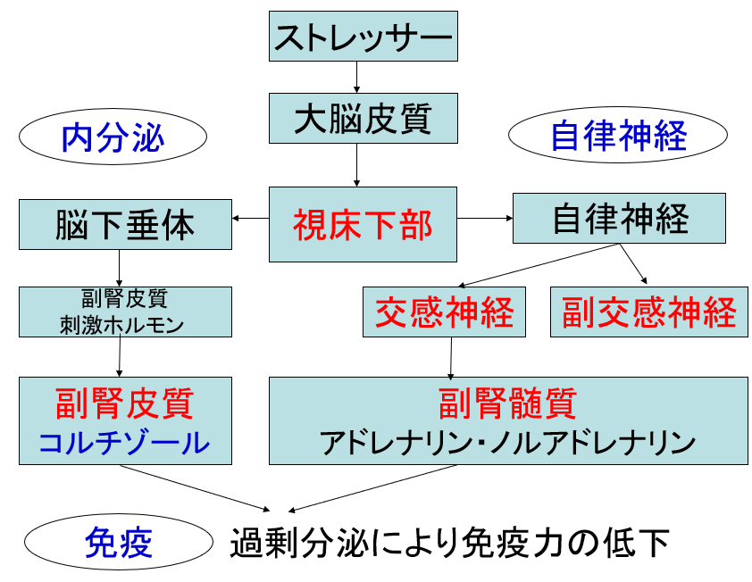 それでは、ホメオスタシスの3大システムである自律神経、内分泌、免疫の3つがどのように関係しているか、フローチャートで見ていきましょう。なお、実際にはさらに多くのホルモンが関係していますが、今回は理解しやすいように重要な点にしぼっています。